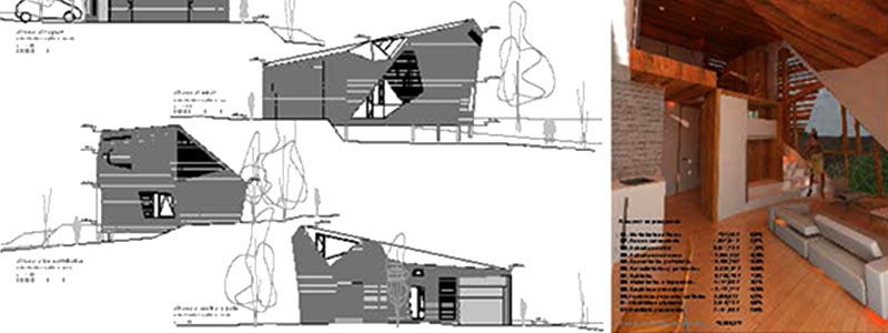 Se trata de una casa de madera, de pequeña huella, cuya estructura mixta combinada con HA, la convierte en adaptable a cualquier topografía. Se usa la madera como material constructivo en sus múltiples formas, (al natural, en tableros etc. ) escogiendo en cada caso la más adecuada no solo por su funcionamiento, sino por su calidad medioambiental y la ecología de medios que supone