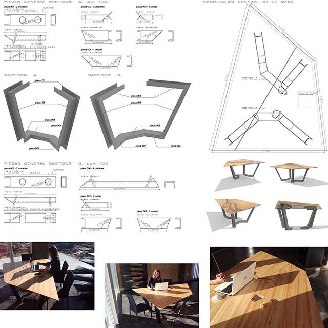 Diseño de mesa para espacio espécifico realizada con un único tablero de madera de pino alistonado de 40mm y perfiles de acero UPN al natural.