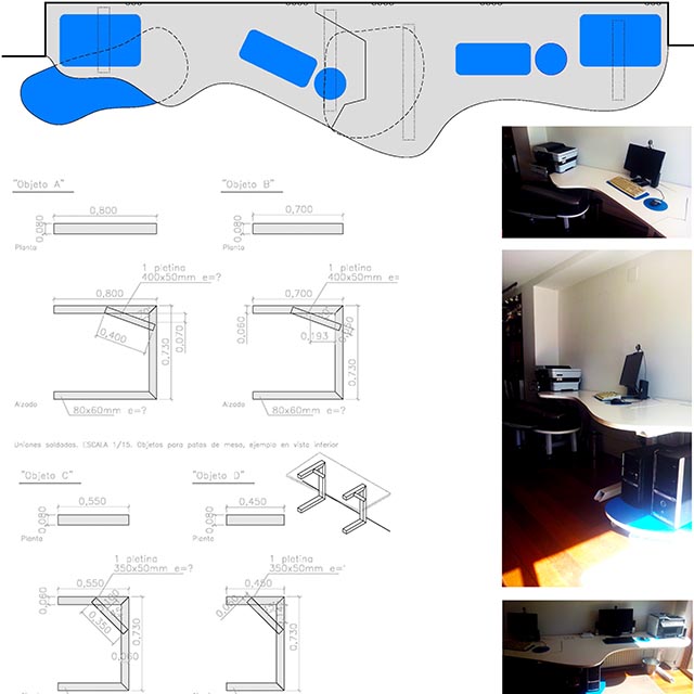 Diseño de mesa y apoyos para espacio espécifico de oficina realizada con un único tablero DM lacado en dos colores de 35mm y perfiles tubulares en ménsulas para liberar frente en acero pintado.