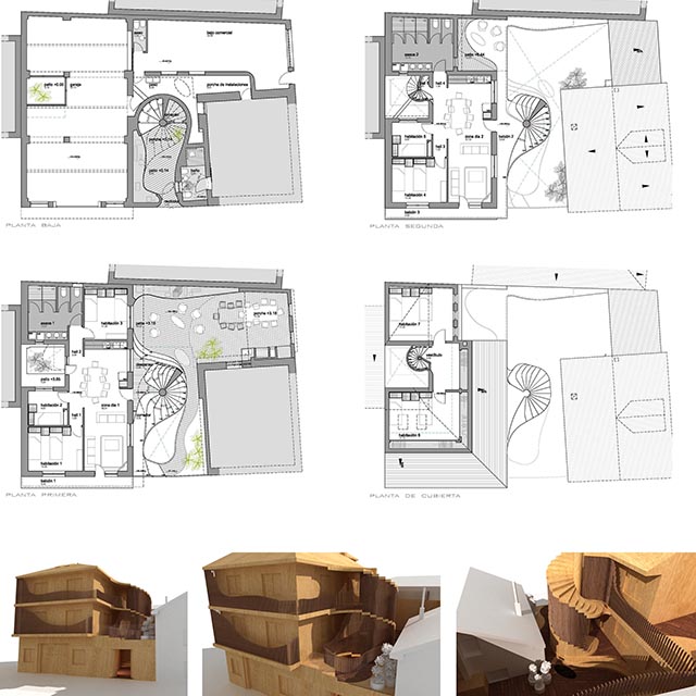 Consiste en la reforma de un pequeño edificio con acceso a plantas mediante escalera exterior y dos viviendas en un albergue.